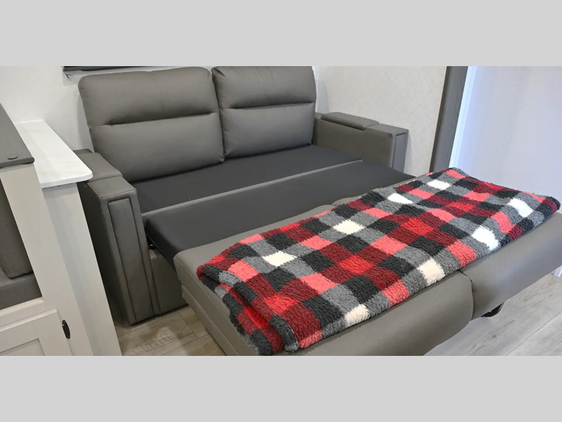 Inside, you'll be met with seamless Thermofoil countertops throughout, Congoleum linoleum flooring that is easy to keep clean, plus a Twice Cool dual ducted A/C system to keep you comfortable. The convenient exterior features, such as Keyed Alike compartment doors and a pressurized spray port, will make camping easier than ever, plus there is a power awning for added protection and solar prep for off-grid capabilities!