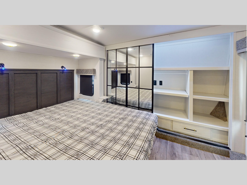 Your toys will stay secure in the garage with 2,500 lb. tie-downs, plus there is a Tuff Ply floor that is non-slip and easy to clean. These toy haulers include many at-home comforts you won't want to camp without, like the two upgraded A/C units, 50" TV in the living area, residential duvet covers, and the list goes on. There are many options to choose from as well that will further customize your fifth wheel, like the generator prep, the roof top solar prep, and the ramp door patio system!