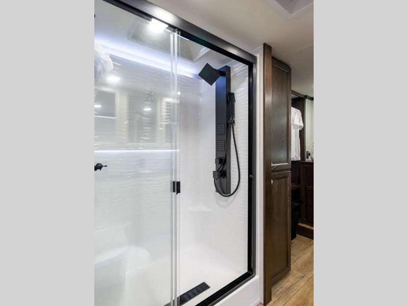 Sleeps 7 Slides 4 Length 43 ft 3 in Ext Width 8 ft 5 in Ext Height 13 ft 3 in Exterior Color Opt. Full Body Paint; Onyx, Sapphire, Opal Hitch Weight 2860 lbs GVWR 16855 lbs Dry Weight 14484 lbs Cargo Capacity 2376 lbs Fresh Water Capacity 75 gals Grey Water Capacity 123 gals Black Water Capacity 41 gals Available Beds King Refrigerator Type 110V Refrigerator Size 20 cu ft Cooktop Burners 3 Shower Size 48" x 30" Number of Awnings 1 Water Heater Type Suburban Tankless TV Info LR 50" Smart TV, BR 32" Smart TV, Ext. 50" TV Awning Info 21' w/ LED Night Lighting Axle Count 2 Shower Type Standard Solar Wattage 200 watts Similar Floorplans