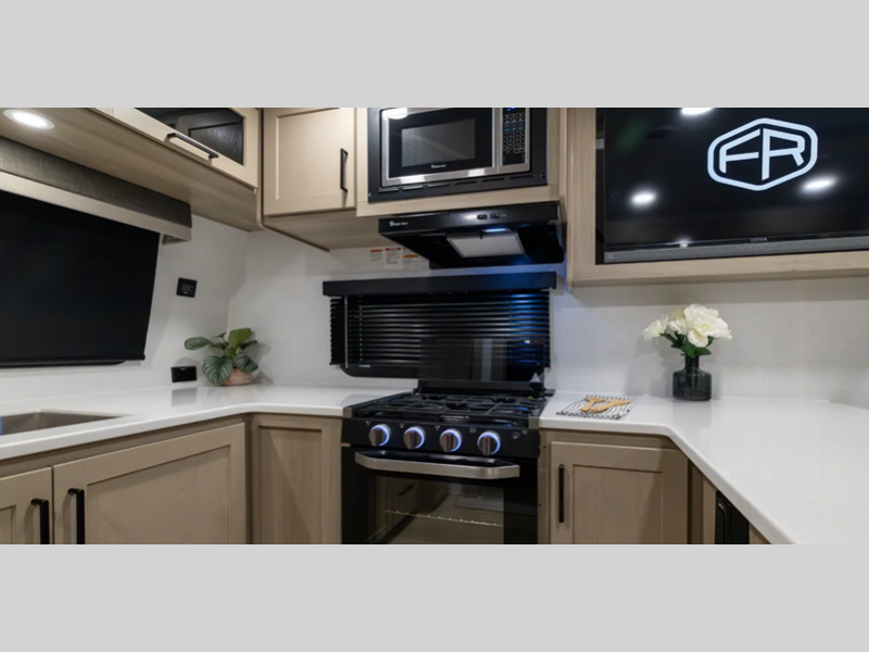 Each travel trailer will have you feeling right at home with its hidden hinge cabinet doors, plus solid surface kitchen countertops and roller shades for added privacy. The Showermiser water saving system is sure to come in handy while camping over the weekend, and the TV with a stereo ensures you'll never go bored. Towing is made hassle-free thanks to the power tongue jack, along with Dexter Torflex axles and Goodyear Endurance tires.