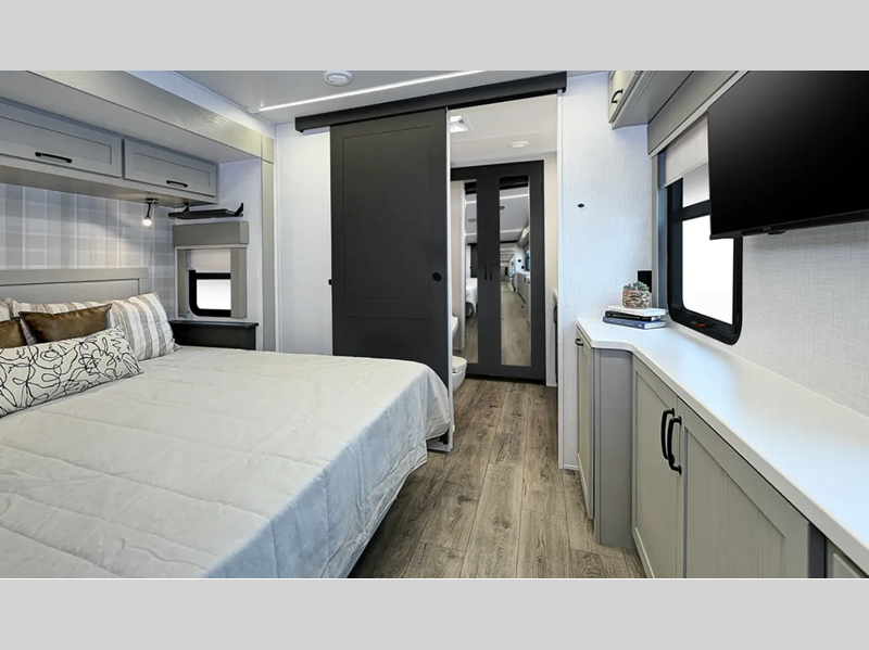 The 8' 5" wide-body provides more interior space to stretch out, and you'll be met with high-end kitchen amenities plus a larger bedroom and bath for a more residential feel. The mandatory Comfort Package includes upgraded residential style hardware, marine grade woven flooring in the slides, and many more luxuries. You'll appreciate the 6-point hydraulic leveling system and the upgraded suspension, along with a tire pressure monitor system and two Quietcool 15K BTU Serenity A/Cs, plus more features within the mandatory Voyager Package!